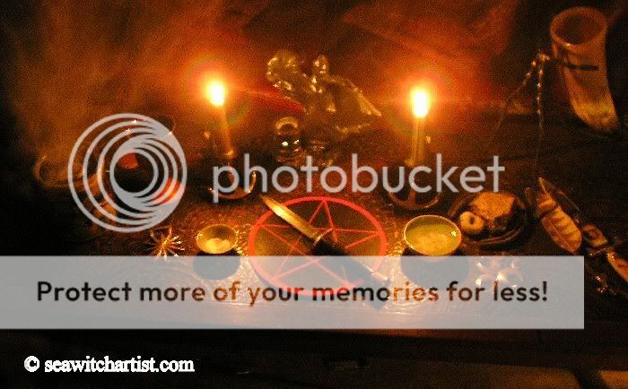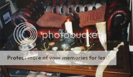 ![]() I use a table that leads a normal life when it's not an altar, I never did get into the habit of using an altar cloth myself, to much work getting wax out of them! My past as a sea witch, well....joining a coven never really got that out of me altogether, is reflected in marime things here, anchor style candle holders, sea salt, hag stones,a scourge made from a piece of the Cutty Sarks rope made to look like the 'horse tail' held in the hand of that ships figure head..... http://www.seawitchartist.com/cuttysark-figurehead.htm , the items on it where gathered over quite a long time, some things expensive, some things for free, they all 'fell into my hand' that is they suit me. For God and Goddess symbols I use two Horse brasses, one depicting a solar symbol, the other a lunar one. All this evolved over some years, the bottom picture is the ollder one, notice the changes?